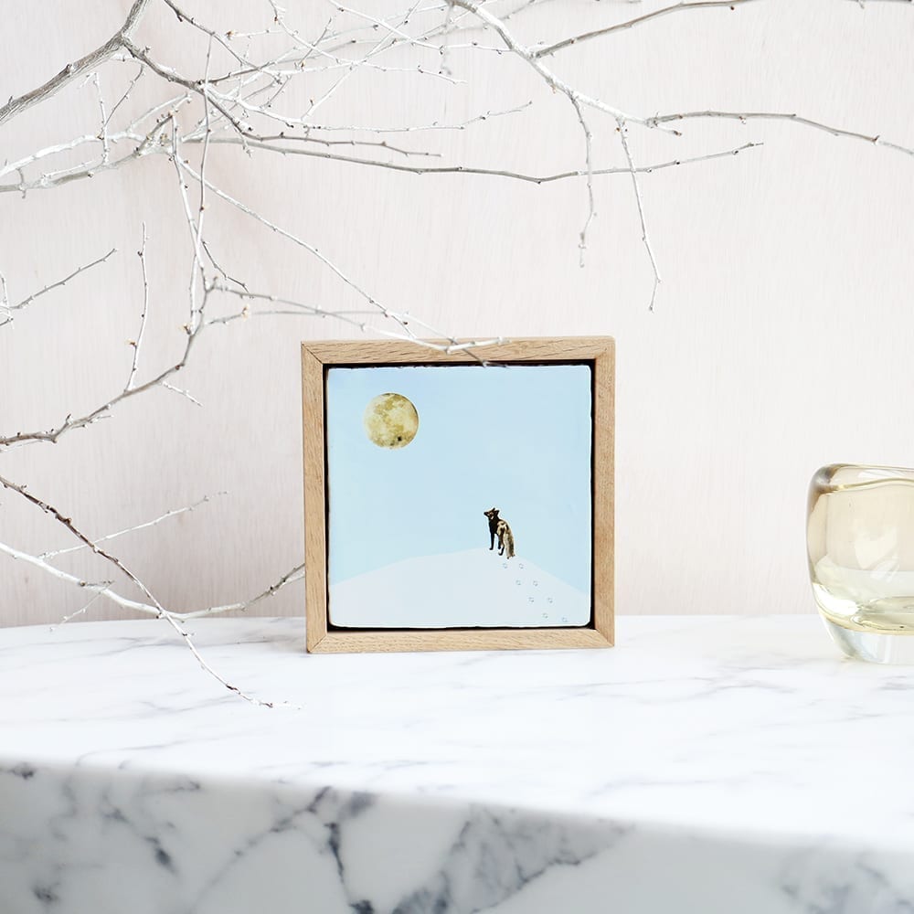 StoryTiles VOLLE MAAN Heb je ooit een momentje voor jezelf gepakt en naar de volle maan gekeken, zoals deze vos Keramische tegels worden al sinds de 16e eeuw gemaakt in Delft en omstreken. StoryTiles eert deze traditie en creëert miniatuurverhalen op tegels. Alle tegels worden in Nederland ambachtelijk gebakken op hoge temperatuur. De kunstwerkjes zijn dus hitte- en waterbestendig waardoor het bijzondere design levenslang mee gaat. Elk ontwerp is met de hand gebakken en daarmee uniek.